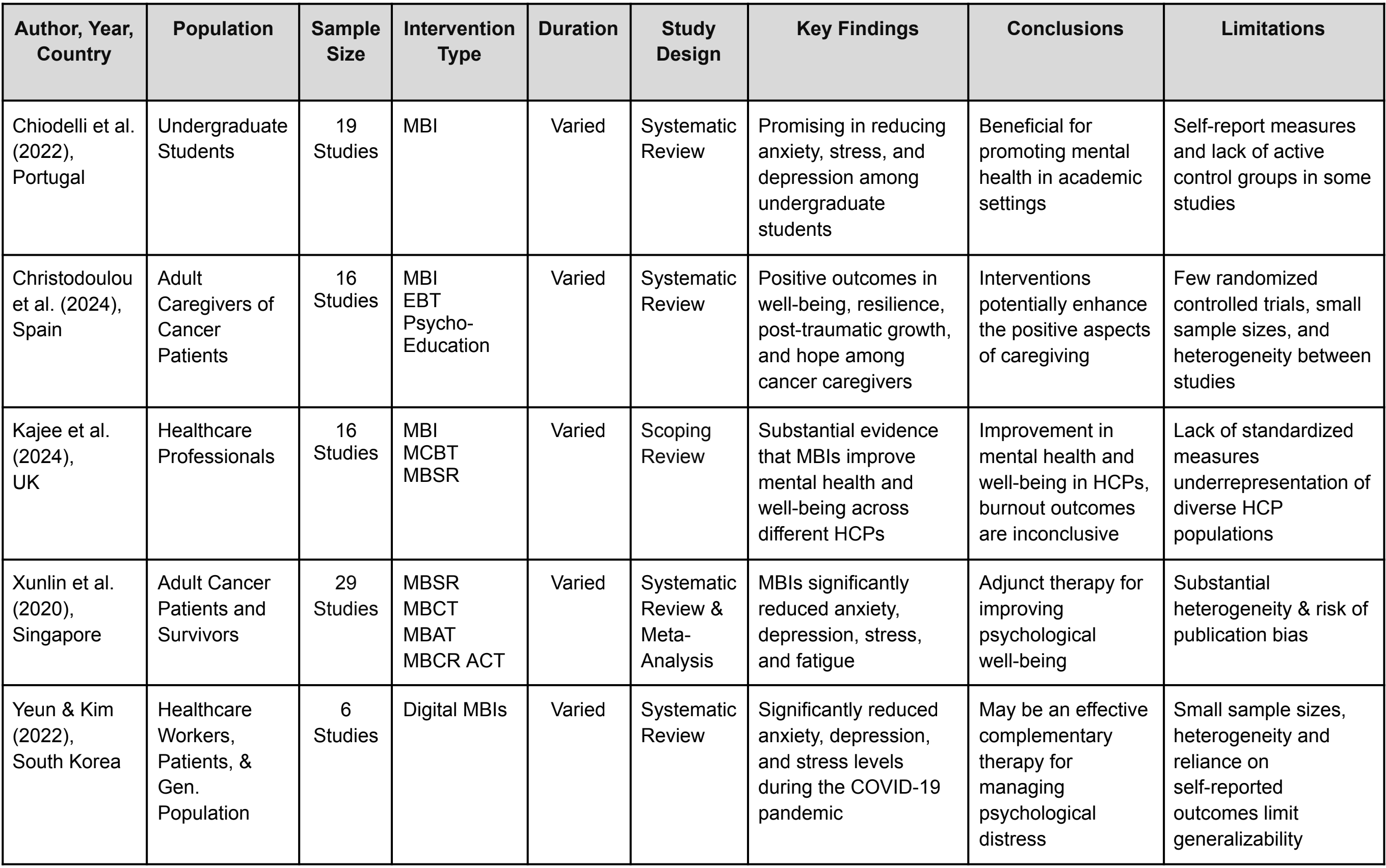 Mindfulness practices have been part of the Western world for decades, but research in this once-niche area has recently surged, particularly since the onset of the COVID-19 pandemic. While interest in MBIs has gained traction in several areas, there is a clear parallel between the start of the pandemic and an emerging focus on stress, anxiety, and burnout, particularly within the medical field. An analysis of 14 systematic reviews highlights several significant trends in this research area. Over the past five years, healthcare workers have been immersed in extreme stress, working gruelling hours while their bodies ache for much-needed rest, all while the emotional toll of worrying about their families and processing an overwhelming amount of death weighs heavily on their minds. In response to what felt like an insurmountable crisis, researchers acted with both creativity and urgency, rapidly developing initiatives such as team-based mindfulness programs aimed at improving communication, support, and cohesion within medical teams. Additional efforts focused on adapting existing MBIs, such as Mindfulness-Based Stress Reduction (MBSR), to help healthcare workers relieve stress, build resilience, and recover from burnout without adding further burden, and introducing digital MBIs as a cost-effective and scalable solution, particularly for healthcare workers in rural and underserved areas.